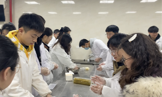 的同志向大家讲解了樱花糕的制作过程:“将原料和黄油放置碗后揉至细腻光滑,控制食用色素的添加量,然后再将面团放入模具后推出。”两个党支部的同学互相交流制作经验,其乐融融,活动接近尾声,同志们看着一个个做好的樱花糕,都露出了满意的笑容。食物经济与营养健康研究生党支部的柏忠虎同志谈到:“记得支部成立之初,支部指导老师青平给我们立下标准‘要发挥党支部的战斗堡垒作用,走出书桌、走到群众中去,让党建引领科研,面向党和国家的战略需求做研究’。而今天的活动充分呼应了这个标准,两个支部的研究对象都与食物相关,以樱花为媒介,不仅搭建起两个支部沟通交流的桥梁,也通过亲自动手制作樱花糕领会到了“大食物观”的深刻内涵,做到知行合一。”