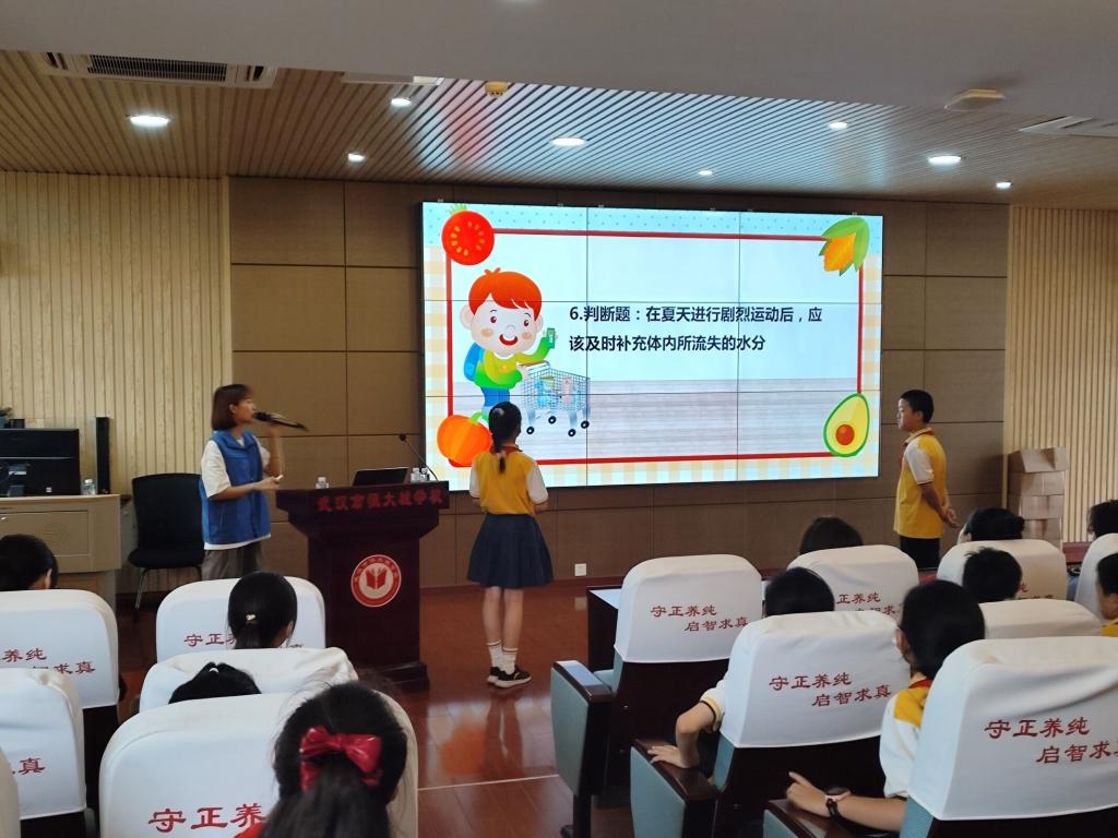 为了普及食品安全知识教育,进一步促进食品安全知识深入学生层面,提高食品安全防范意识,增强全社会食品安全共管共治,7月4日下午,武汉东西湖区市场监督管理局联合华中农业大学“食品安全与营养武汉行”博士团在东西湖区恒大城小学开展了一场以“暑期膳食营养与安全” 为主题的食品安全科普宣讲活动,并以此次活动为契机,举办了2023年东西湖区食品安全科普宣传“进校园”活动。东西湖区市场监督局王进科长和恒大城校长受邀出席,来自武汉市东西湖区恒大城小学的教师和四年级学生100余人参与了此次活动。