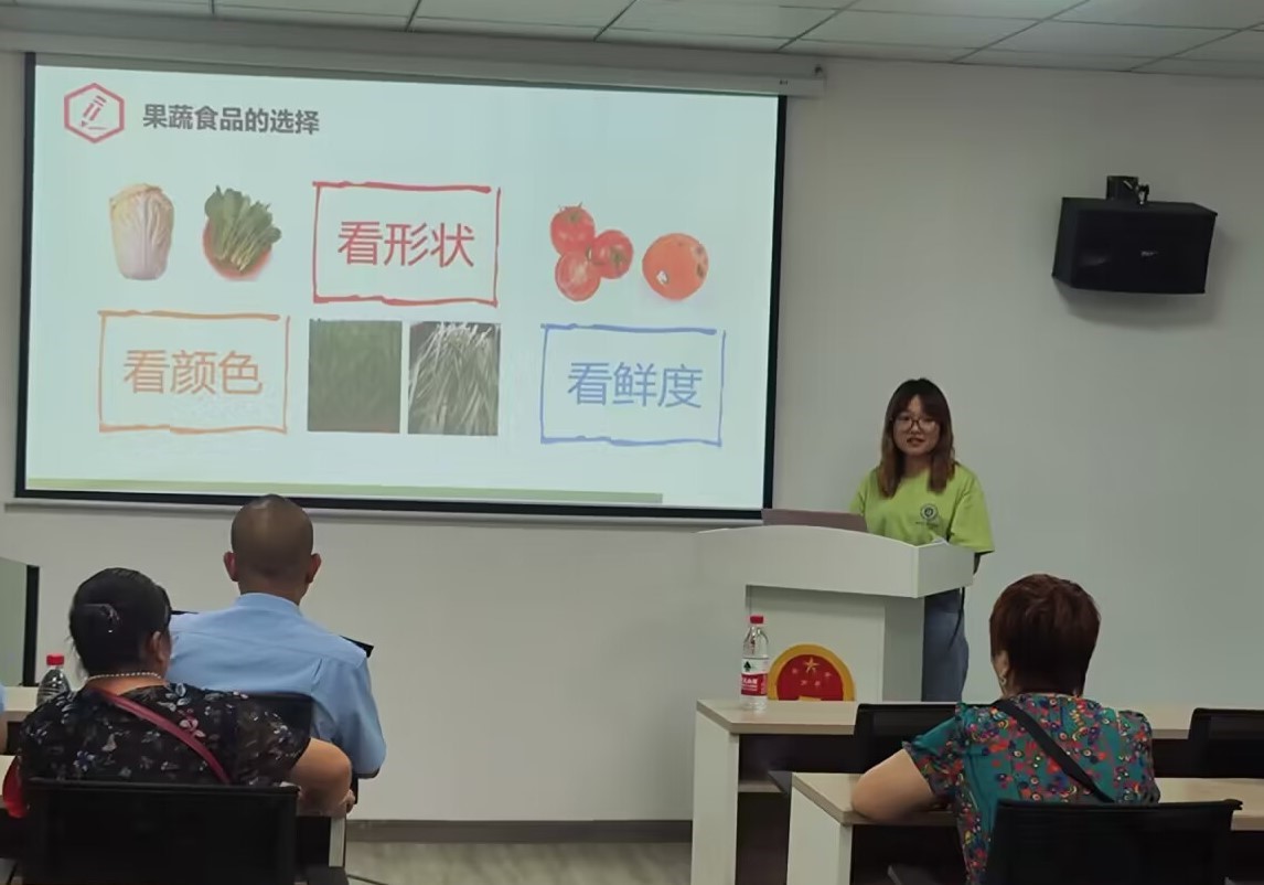 “果蔬在我们日常生活中占据着重要的作用,补充着人体需要的维生素和膳食纤维等多种营养物质,但是在日常生活中,果蔬产品很容易存在农药残留、重金属污染、植物类激素以及微生物污染等风险,因此,关于果蔬的挑选和储存至关重要。”志愿者杨慧芳以果蔬为切入点,向社区居民介绍了果蔬的“三看”挑选方法,即一看颜色、二看形状、三看鲜度,对于太硬的西红柿、太浅的绿叶菜、有裂心的萝卜等食物要禁止购买。另外,关于果蔬储存问题,主要是注意果蔬的保鲜期,不宜存放过久。例如,在阴凉通风处,绿叶蔬菜可以存放两三天,番茄、黄瓜、萝卜类蔬菜可以存放两周左右的时间;热带水果,尤其是香蕉不能放在冰箱冷藏,否则表皮会产生黑色斑点,加速变质。