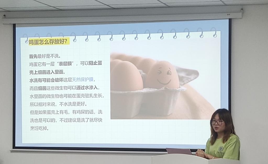 紧接着,志愿者杨慧芳向居民介绍了鸡蛋和肉类的挑选与储存。其中,对购买鸡蛋的几个常见误区——“鸡蛋壳颜色深的比较好吃?蛋黄颜色较深是加了色素吗?鸡蛋洗干净再存放更卫生?”进行了一一解答。杨慧芳解释道:“蛋壳的颜色深浅和下蛋母鸡的种族有关,母鸡在产蛋前会分泌一定的色素给蛋壳上色,而这色素是由母鸡的基因决定的,和蛋的营养成分、烹饪内容和鸡蛋品质没有关系;蛋黄的颜色深,和叶黄素有关,是因为母鸡摄入了很多富含叶黄素的食物;生鸡蛋存放前最好不要水洗,是因为生鸡蛋表面有一层天然保护膜,可以阻挡细菌进入里面,而水洗刚好破坏了这层保护膜。如果进行水洗,要尽早烹饪,不宜存放太久。”最后,杨慧芳围绕猪肉、牛肉和鸡肉这三类肉品分别进行了挑选和储藏方法的详细介绍,特别提醒到,生熟肉分开储藏,冷藏肉3天内食用最佳,冷冻肉存放不要超过3个月。