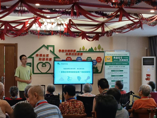 本次活动由科普团志愿者曹雍作为主讲人,他从“食品安全、食品营养、科学健身”三个方面,生动形象地讲解了老年人如何去关注日常生活中的饮食安全与身体健康问题。