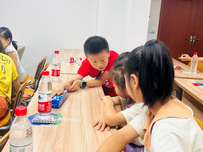 在掌握基础判别零食优劣规则的前提下,同学们开始零食大世界的奇妙探索,志愿者余琴带大家一起发现奥利奥和矿泉水中的成分奥秘。张章(化名)同学观察得非常认真,还和同伴交流着自己的发现。