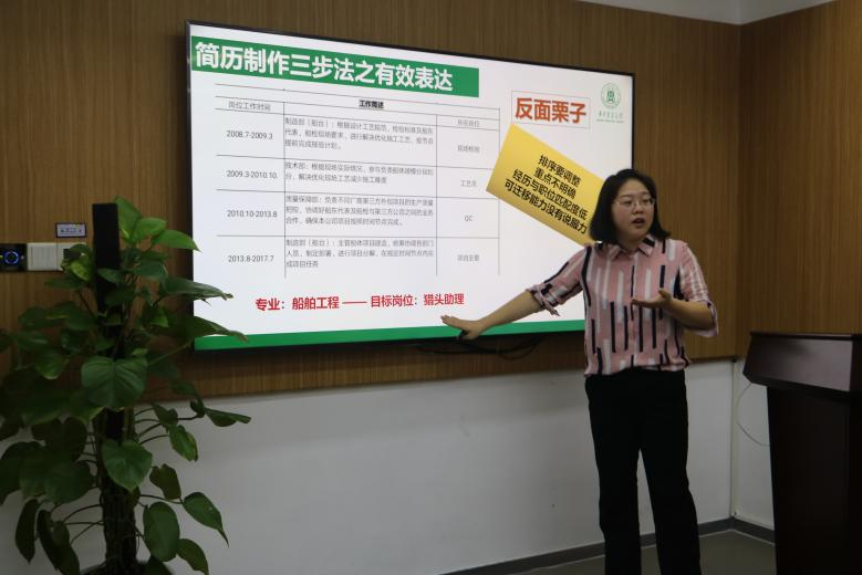 林老师还说:简历就是一段有针对性的个人传记,简历的精准性针对性至关重要。她从一个反面例子展开,告诫同学们首先应分析目标职位要求、梳理自身能力结构和匹配有效表达,就能避免犯类似错误。