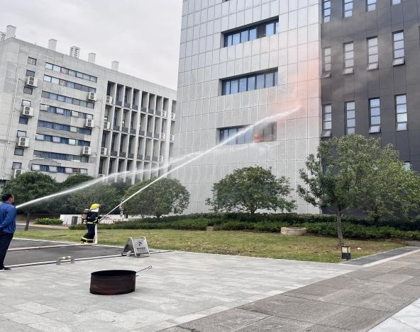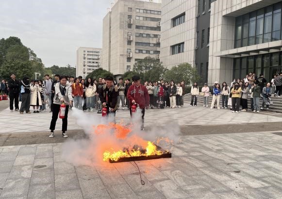 本次实战重点为实验室或大楼内突发火灾事故时,师生如何扑灭初起火灾并做到快速疏散。楼内响火灾警报声后,各实验室参演师生听到警报声后迅速反应,在各楼层安全出口安全员的引导下迅速向楼外有序撤离。待大楼内师生按照设定的疏散路线撤离至安全区域后,建安部联合消防救援大队举行灭火技能实战操作演练,共100余名同学参与灭火器实操演练。