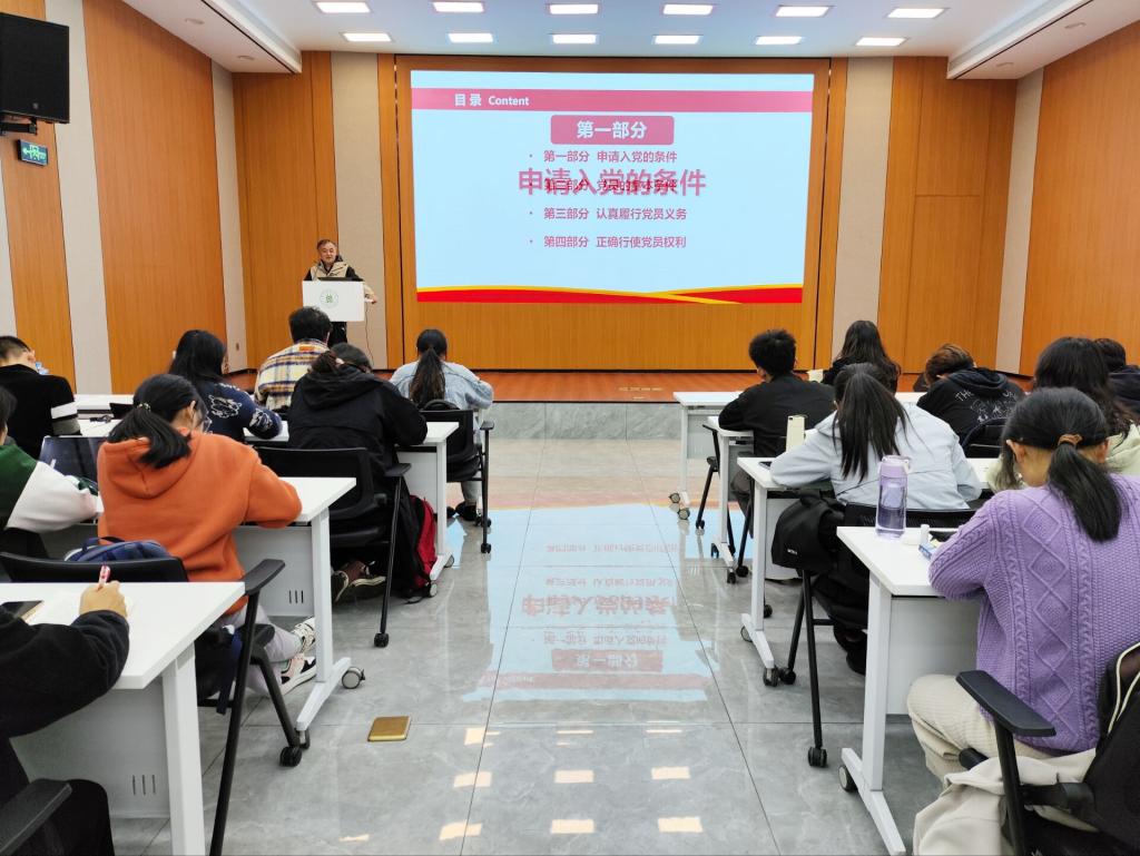 党委书记杨铁贵面向全体积极分子讲授《中国共产党党员的条件、义务和权利》一课,引导同学们端正入党动机,不断向党组织靠拢。