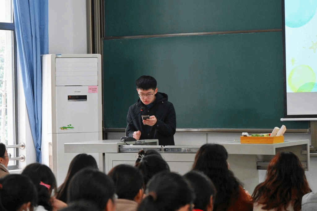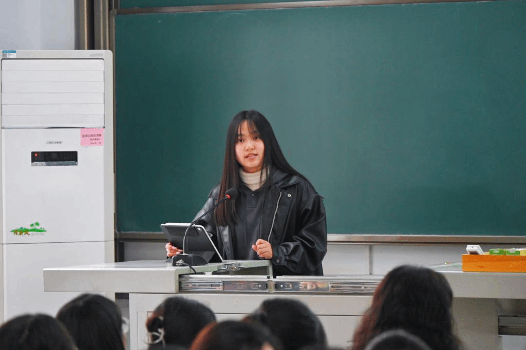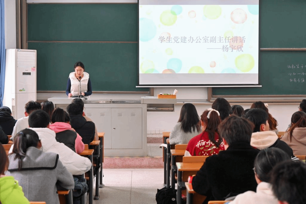 随后,学生党建办公室副主任杨宇欣上台发言,着重强调了如何培养日常理论学习习惯,并推荐大家使用相关软件。她讲道,理学部公众号的“每日一词”栏目及党建公众号的“每日一闻”栏目,都是很好的碎片化学习途径,大家每天了解一点点,便可以推动长足的进步。她向大家提出要将思想转化为行动,把握规律,坚定自身的理想信念的期望。