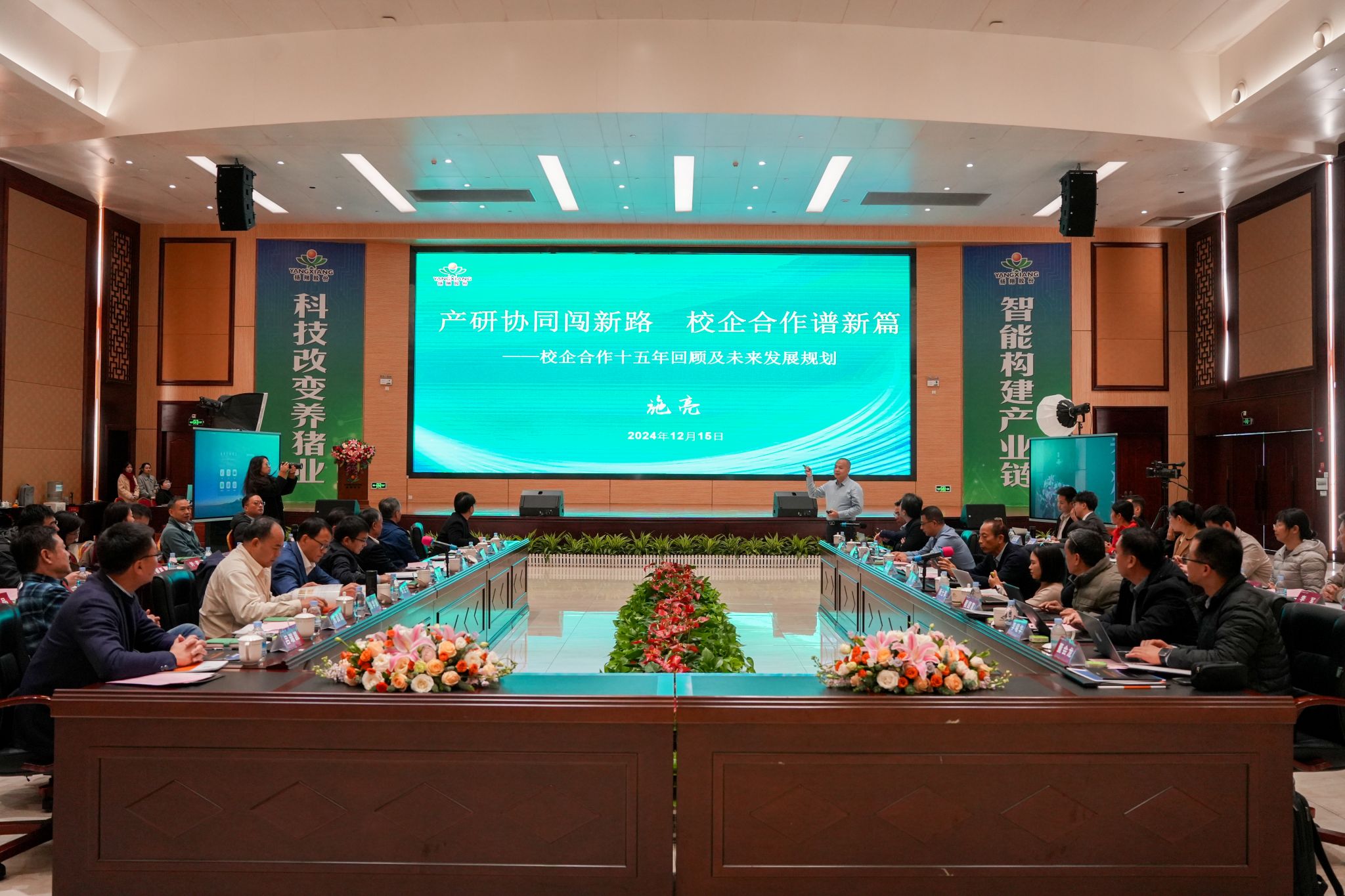 上午的座谈会上,施亮介绍了扬翔集团的发展概况及校企合作情况。他希望通过与华中农大的深度合作,共同推动以智能设施楼房养猪为核心的全产业链技术创新和人才培养。