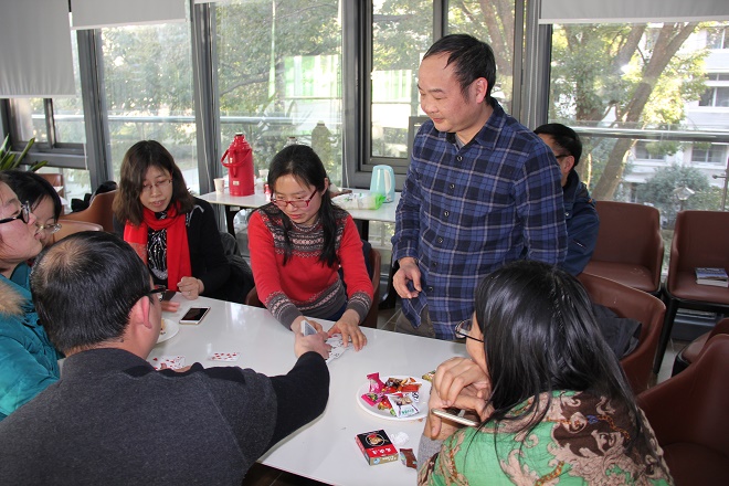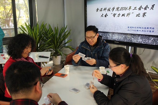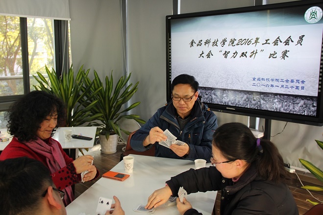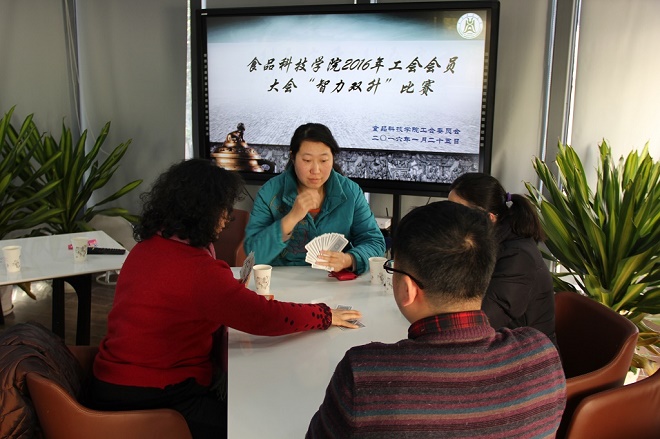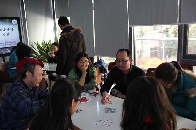 2016年1月25日,雷速篮球 工会组织会员在院楼阳光房举办了一场“智力双生”比赛。经系内报名、选拔,共十支队进入了上午的淘汰赛环节。经过下午决赛环节,获得前四名的组队依次为:李艳和李小定队,李秀娟和蔡朝霞队,王佳和陈万平队,郭爱玲和吴仁蔚队。